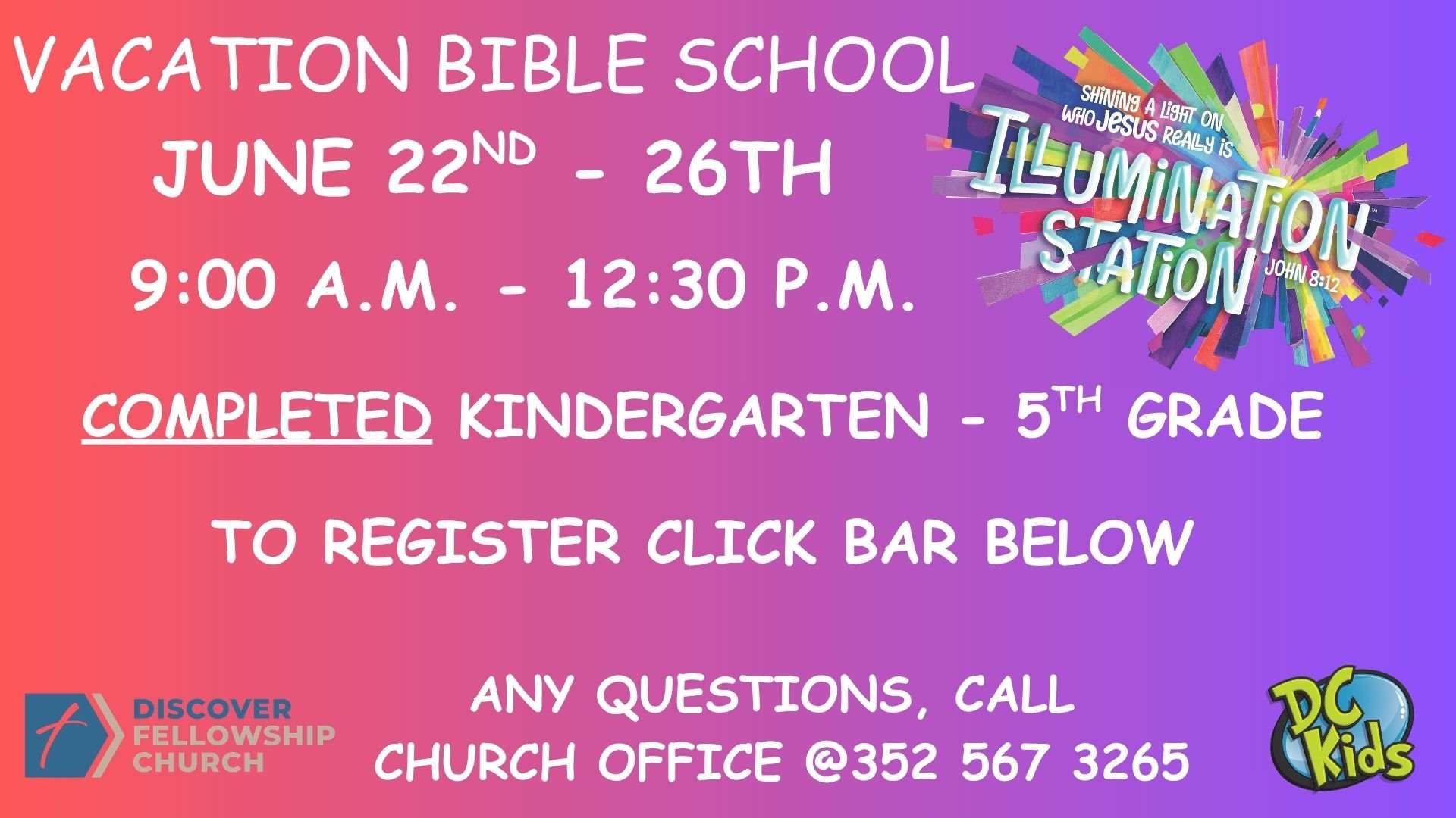 AWANA clubs will resume Fall 2026 and is for ages 2 years through 5th grade. It will be 6:30pm each Wednesday night. For more information Click Here!